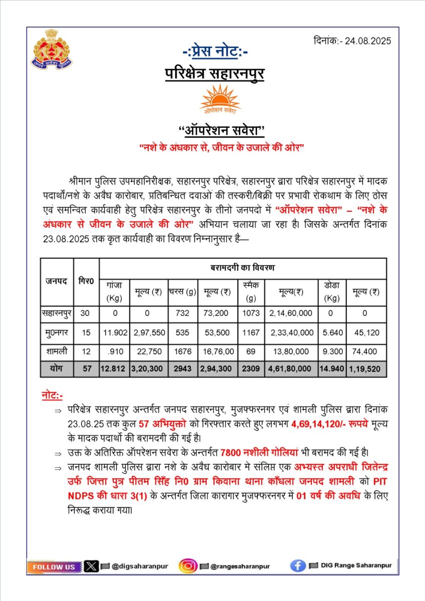 सहारनपुर(मनीष अग्रवाल)। पुलिस उपमहानिरीक्षक, परिक्षेत्र,अभिषेक सिंह सहारनपुर के कुशल एवं दृढ़ नेतृत्व में परिक्षेत्र सहारनपुर के अंतर्गत मादक पदार्थों, प्रतिबंधित दवाओं की तस्करी एवं अवैध बिक्री के विरुद्ध प्रभावी कार्यवाही हेतु एक विशेष अभियान “ऑपरेशन सवेरा : नशे के अंधकार से, जीवन के उजाले की ओर” संचालित किया जा रहा है।