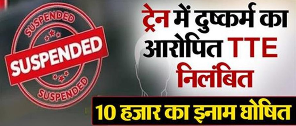 जिले की एक युवती ने चलती ट्रेन में टिकट जांच कर्मचारी (टीटीई) पर दुष्कर्म के प्रयास मामले में आरोपित टीटीई राहुल कुमार को रेलवे प्रशासन ने निलंबित कर दिया है। आरोपित की गिरफ्तारी के लिए एसपी रेलवे ने पुलिस टीम का गठन कर आरोपी पर 10 हजार रुपये इनाम घोषित कर दिया है। आरोपी पटना (बिहार) के बिहटा स्थित समसारा गांव का रहने वाला है।