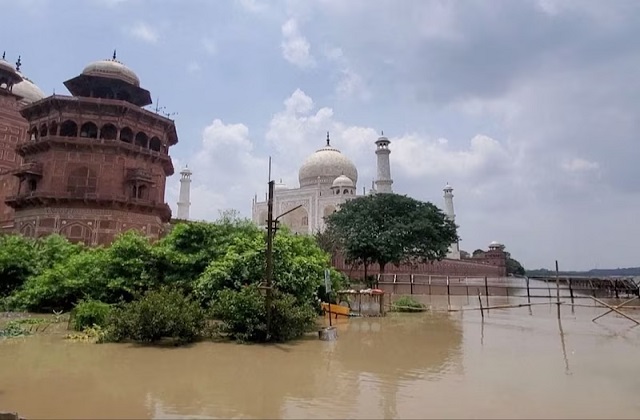 यूपी के कई जिले इस समय बाढ़ से प्रभावित है। सैकड़ों गांव में पानी घुसा है और जन-जीवन अस्त व्यस्त हो गया है। इसी बीच ताजनगरी आगरा में भी यमुना नदी का जलस्तर लगातार बढ़ रहा है और खतरे के निशान को पार कर गया है। जलस्तर इतना बढ़ गया है कि ताजमहल की दीवार को छू रहा है।