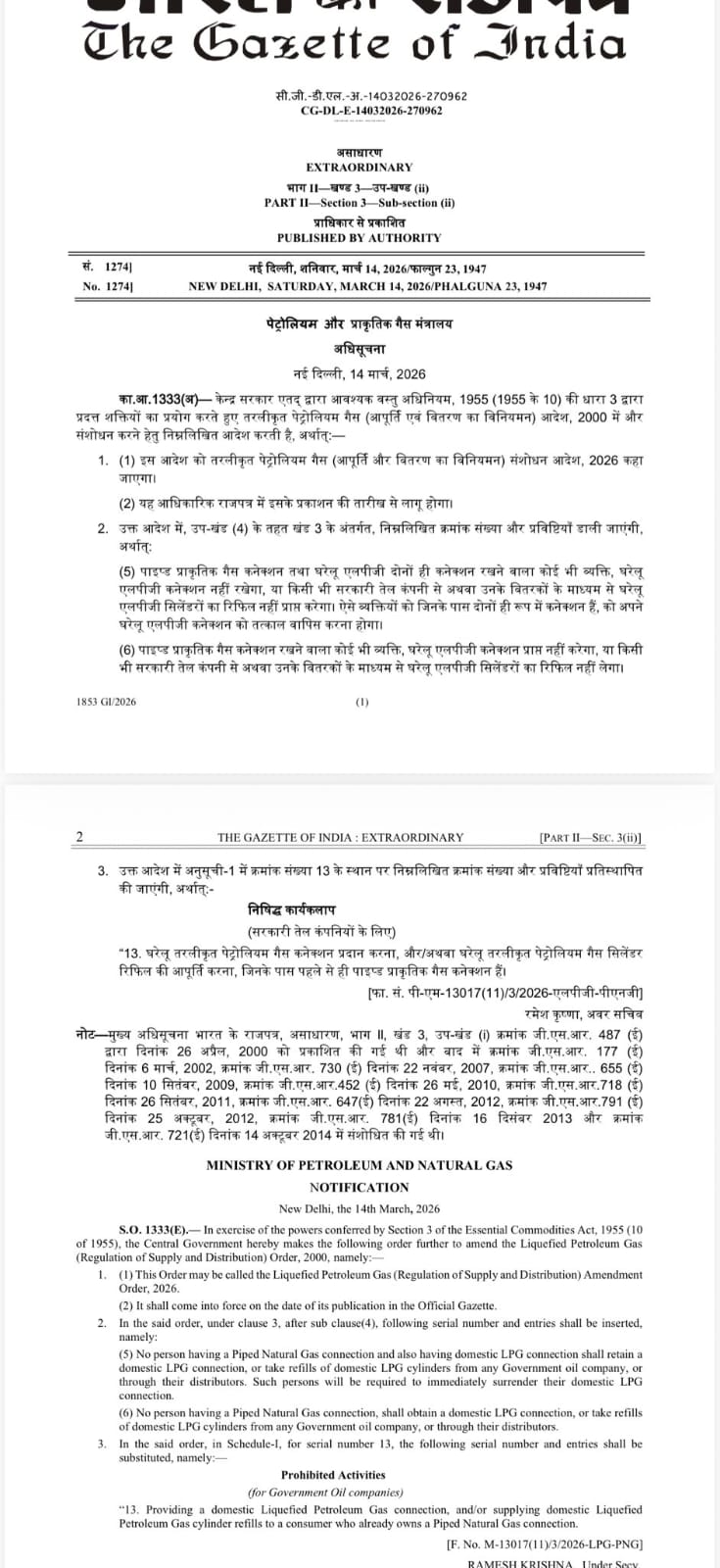 दिल्ली। पेट्रोलियम मंत्रालय ने LPG सप्लाई नियमों में किया बड़ा परिवर्तन, PNG कनेक्शन वाले उपभोक्ताओं को घरेलू LPG सिलेंडर नहीं मिलेगा, जिनके पास PNG और LPG दोनों हैं, उन्हें LPG कनेक्शन सरेंडर करना होगा !!