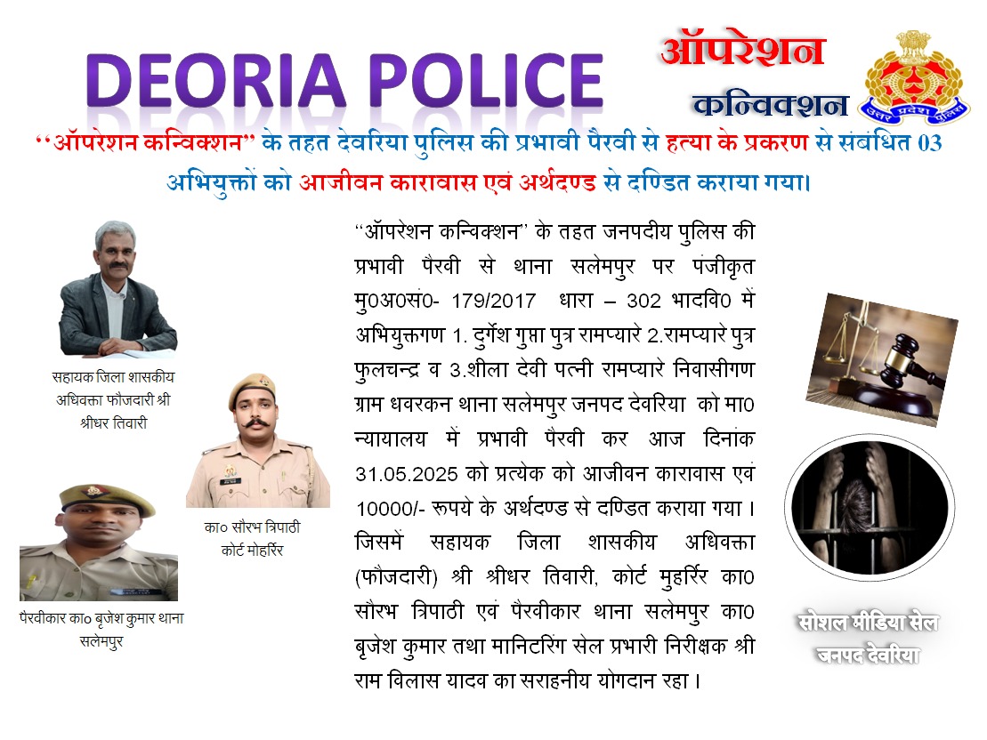 देवरिया : हत्या प्रकरण में तीन अभियुक्तों को आजीवन कारावास एवं अर्थदण्ड से दण्डित देवरिया, 31 मई (हि.स.)। सलेमपुर कोतवाली में दर्ज हत्या के प्रकरण में तीन अभियुक्तों को आजीवन…
