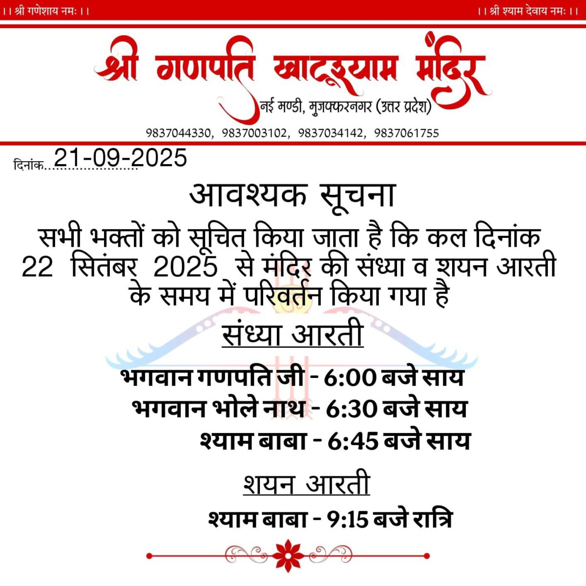 मुजफ्फरनगर। नई मंडी स्थित श्री गणपति खाटूश्याम मंदिर में अब आरती का समय बदल गया है। मंदिर प्रबंधन की ओर से जारी की गई जानकारी के अनुसार सोमवार 22 सितंबर से संध्या और शयन आरती नए समय पर होगी।