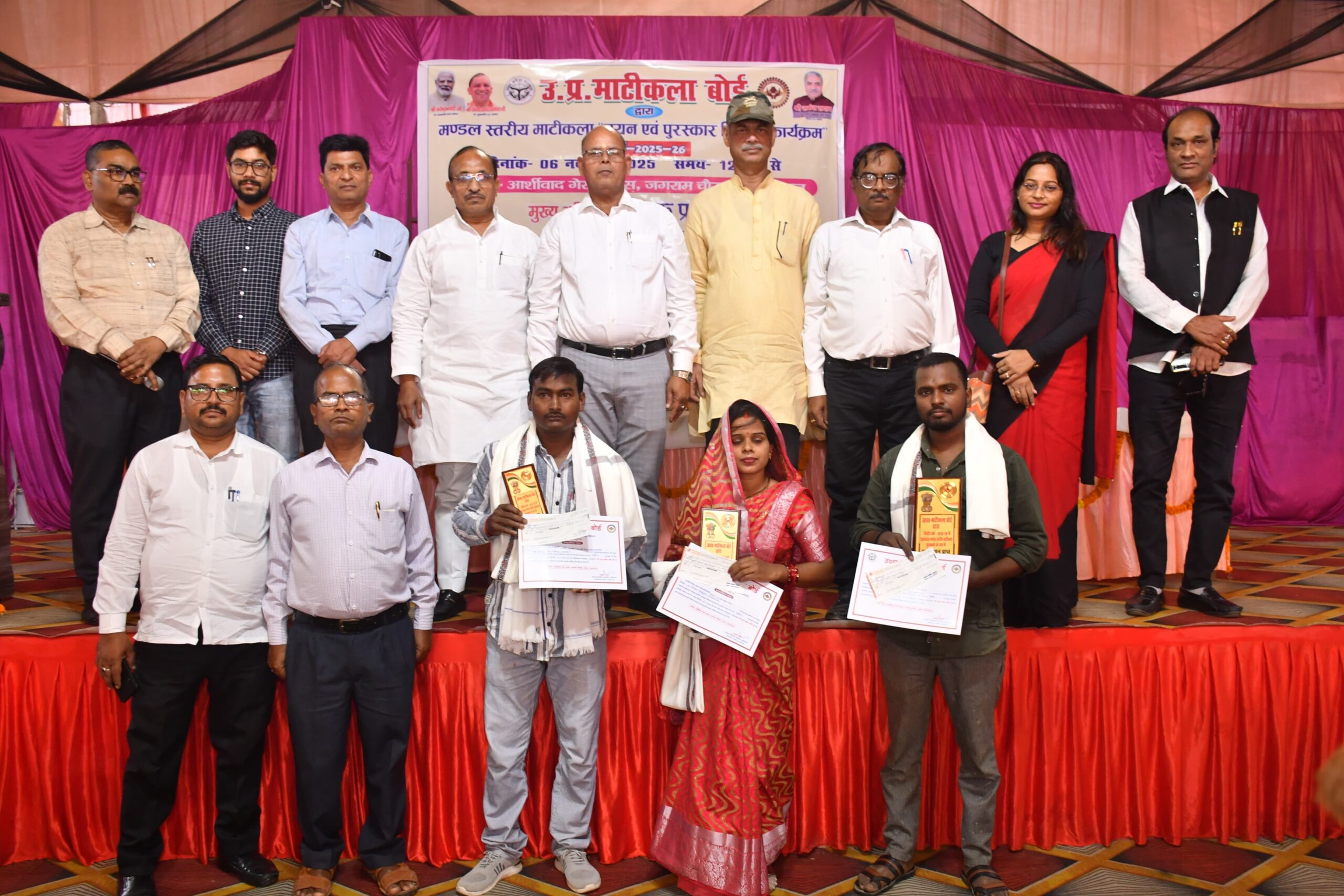 उत्तर प्रदेश माटीकला बोर्ड-प्रयागराज के तत्वावधान में मण्डल स्तरीय माटीकला पुरस्कार योजना के तहत मण्डल स्तरीय माटीकला पुरस्कार वितरण कार्यक्रम का आयोजन कटरा स्थित एक गेस्ट हाउस में गुरूवार को किया गया। पुरस्कार कार्यक्रम में प्रयागराज मण्डल के जनपदों, प्रयागराज, प्रतापगढ़, फतेहपुर व कौशाम्बी से प्रजापति समाज से जुड़े अनेकों मूर्तिकारों एवं शिल्पकारों ने अपनी-अपनी स्वरचित कला कृतियों के साथ प्रतिभाग किया। जिनमें उत्कृष्टता के आधार पर प्रथम, द्वितीय व तृतीय पुरस्कार के रूप में निर्णायक मण्डल रवीन्द्र नाथ कुशवाहा, सदस्य राज ललित कला अकादमी, तलत महमूद, कला अध्यापक, सौमिक नन्दी, असिसटेन्ट प्रोफसर इलाहाबाद विश्वविधालय साधना गोस्वामी, कला अध्यापिका, बेथनी कान्वेंन्ट स्कूल नैनी ने चयन किया। जिसमें प्रथम पुरस्कार प्रयागराज के जंगबहादुर प्रजापति, द्वितीय पुरस्कार प्रयागराज की श्रीमती स्वेता प्रजापति, तृतीय पुरस्कार प्रतापगढ़ के धर्मेंद्र कुमार प्रजापति को प्रदान किया गया। जिसमें क्रमशः प्रथम, द्वितीय व तृतीय को पुरस्कार स्वरूप क्रमशः 15000, 12000, 10000 हजार की धनराशि चेक के माध्यम से तथा प्रमाण-पत्र एवं स्मृति-चिन्ह और अंग-वस्त्र प्रदान किया गया।