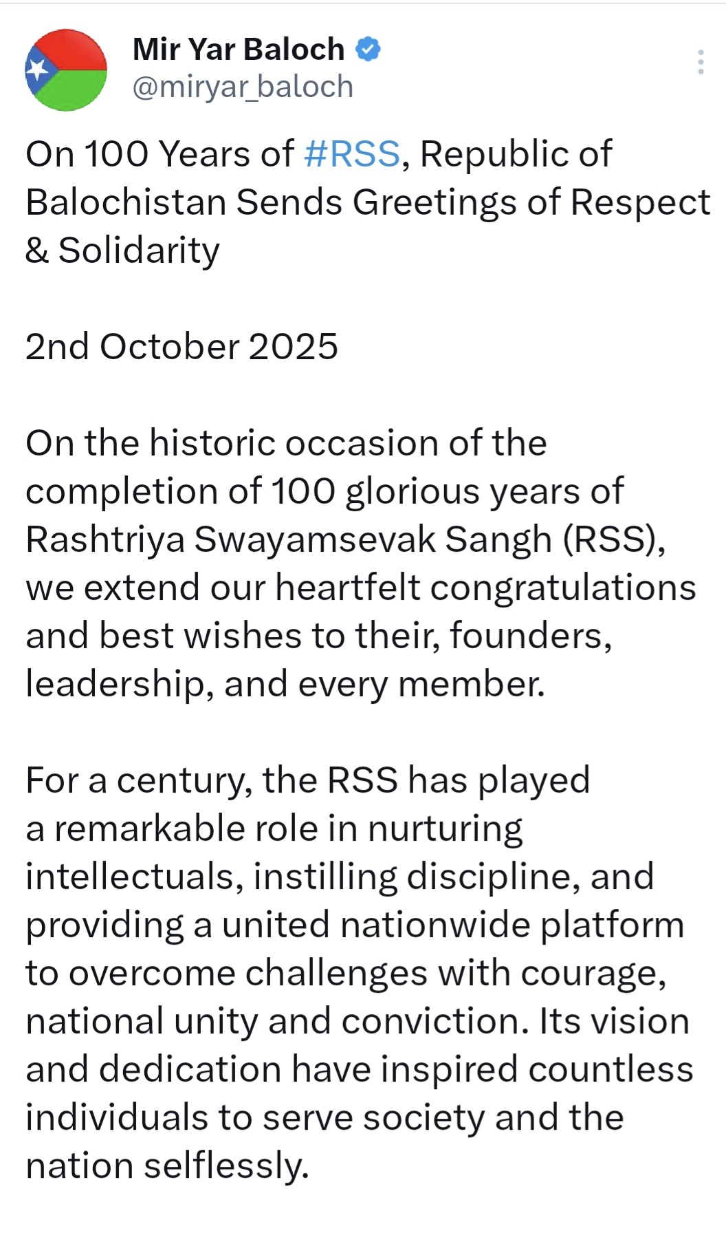 बलाेचिस्तान मुक्ति आंदोलन के सक्रिय कार्यकर्ता मीर यार बलाेच ने गुरूवार काे संघ काे भेजे संदेश में कहा, “संगठन के गौरवशाली 100 वर्ष पूरे होने के ऐतिहासिक अवसर पर हम इसके संस्थापकों, नेतृत्व और प्रत्येक सदस्य को हार्दिक बधाई और शुभकामनाएं देते हैं।”