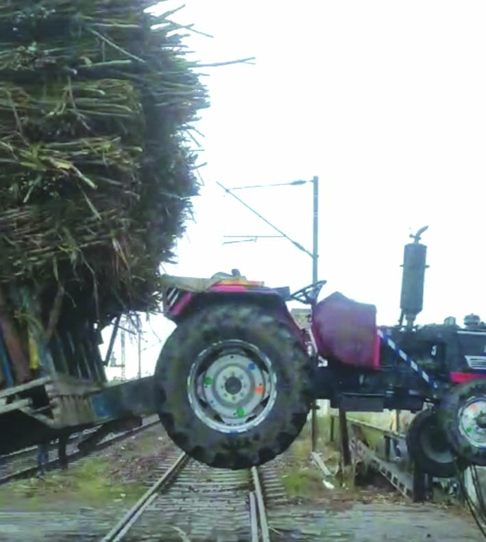 गन्ने से लदी ट्रैक्टर ट्रॉली रेलवे फाटक पर फंसी, 80 मिनट तक बाधित रहा ट्रेन संचालन