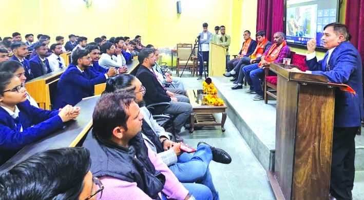 मुख्य अतिथि देवभूमि हॉस्पिटल के मैनेजिंग डायरेक्टर डॉ सुशील शर्मा ने प्रतिभागियों से कहा कि मेडिकल क्षेत्र में ज्ञान अर्जन व अनुभव प्राप्त करने के लिए धैर्य की आवश्यकता होती है। मेडिकल क्षेत्र में वैद्य, भेषज एवं परिचारक स्वास्थ्य की रीढ होते हैं, इसलिए इन तीनों को ज्ञान एवं अनुभव से परिपक्व होना चाहिए। उन्होंने कहा कि फार्मेसी के छात्रों को अपने विषय के गहन ज्ञान को अर्जित करना चाहिए। विशिष्ट अतिथि एकम्स ड्रग्स के एचआर जनरल मैनेजर मयंक शर्मा ने छात्रों को बताया कि भारत सरकार एवं राज्य सरकार उद्यम एवं उद्यमिता विकास के लिए विभिन्न योजनाएं संचालित करती है, जिनमें मुख्य रूप से प्रधानमंत्री उद्यमिता विकास योजना, मुद्रा योजना एवं मुख्यमंत्री स्वरोजगार योजना और इसी प्रकार अनेक योजनाएं एंटरप्रेन्योरशिप के विकास के लिए उपलब्ध हैं। जिनका छात्र अपनी शिक्षा के बाद उपयोग करके अपना स्वयं का उद्योग लगाकर रोजगार उत्पन्न कर सकते हैं।