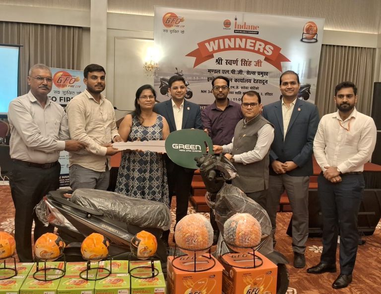 उत्तरी हरिद्वार के एक होटल में आयोजित कार्यक्रम मे एल.पी.जी.मंडल सेल्स प्रमुख स्वर्ण सिंह व हरिद्वार बिक्री क्षेत्राधिकारी मयंक कुमार,नरेंद्र कावरिया,राकेश सिंह ,प्रशांत तिवारी ने ग्रीन फायर ऑफ बॉल विनर्स के 20 विजेता इंडियन गैस एजेंसी ऑनर्स को स्कूटर देकर हौसला बढ़ाया।