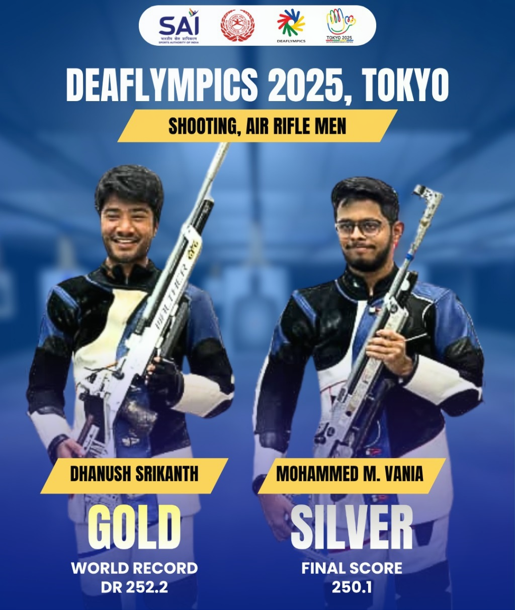 भारतीय खेल प्राधिकरण (साई) मीडिया ने सोशल मीडिया एक्स पर लिखा, ”टोक्यो में डेफलिंपिक्स 2025 में भारत ने शानदार अंदाज में पदकों का खाता खोला। शूटिंग में एयर राइफल पुरुष में धनुष श्रीकांत ने 252.2 के डेफ फाइनल विश्व रिकॉर्ड के साथ स्वर्ण पदक जीता, जबकि मोहम्मद मुर्तजा वानिया ने 250.1 अंक के साथ रजत पदक जीता, जिससे भारत को शुरुआत में ही शानदार डबल पोडियम फिनिश मिली। चांदी की चमक के साथ एक स्वर्णिम शुरुआत और हम देश के लिए और भी पदक जीतने की कामना करते हैं।”