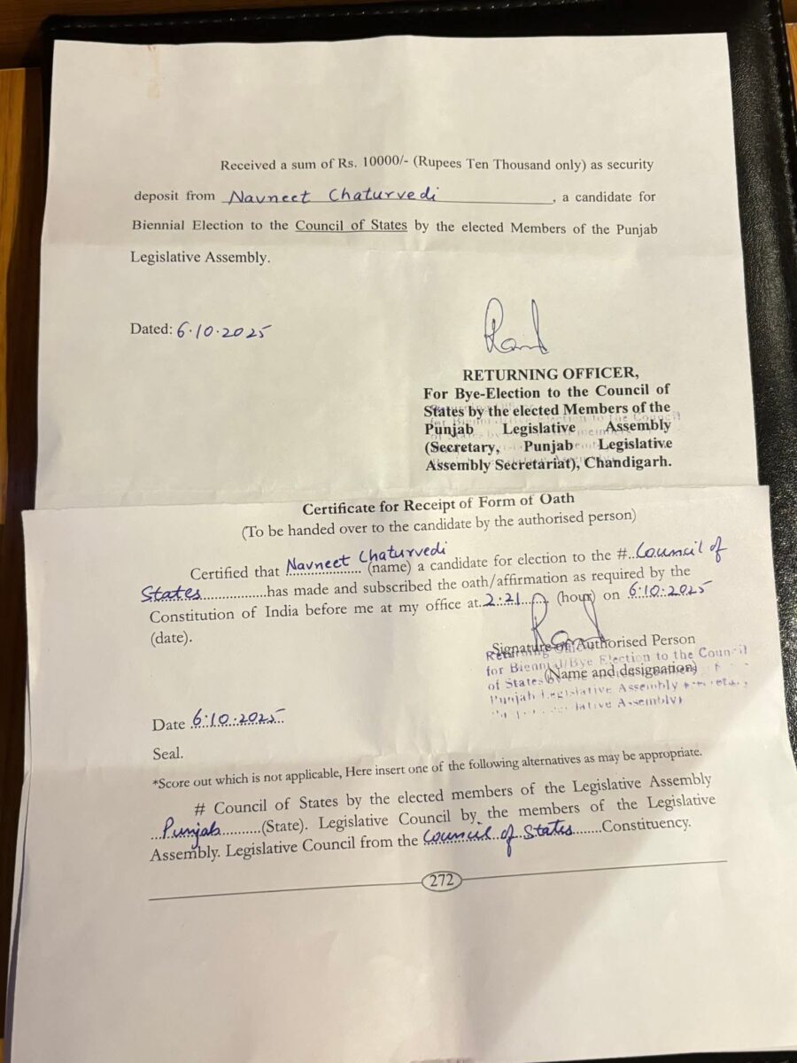दिल्ली | पंजाब की राजनीति में सोमवार को बड़ा सियासी घटनाक्रम देखने को मिला, जब जनता पार्टी के राष्ट्रीय अध्यक्ष नवनीत चतुर्वेदी ने पंजाब विधानसभा स्थित सचिवालय के दफ्तर में बतौर निर्दलीय उम्मीदवार राज्यसभा उपचुनाव के लिए अपना नामांकन दाखिल किया। रिटर्निंग अधिकारी ने उनका नामांकन स्वीकार कर लिया। इस दौरान आम आदमी पार्टी के दस विधायक भी मौजूद रहे, जिन्होंने नवनीत चतुर्वेदी को खुला समर्थन दिया और फॉर्म 2C के साथ उनके पक्ष में नामांकन पत्र सौंपा।