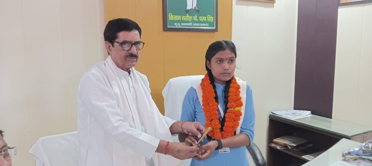 मुजफ्फरनगर। मिशन शक्ति 5.0 के अंतर्गत बेटियों को सशक्त बनाने की दिशा में एक प्रेरणादायक पहल के तहत जय हिंद पब्लिक स्कूल, ग्राम पंचायत मजलिसपुर तोफिर की कक्षा 11 की छात्रा कुमारी अनु चौहान को एक दिन के लिए जिला पंचायत अध्यक्ष का दायित्व सौंपा गया।जिला पंचायत कार्यालय पहुंचने पर अपर मुख्य अधिकारी योगेश कुमार और स्टेनो अक्षय शर्मा सहित अधिकारियों एवं कर्मचारियों ने उनका गर्मजोशी से स्वागत किया। वर्तमान जिला पंचायत अध्यक्ष डा. वीरपाल निर्वाल ने अनु चौहान को कुर्सी पर बैठाकर प्रतीक चिन्ह, बुके और उपहार देकर सम्मानित किया।