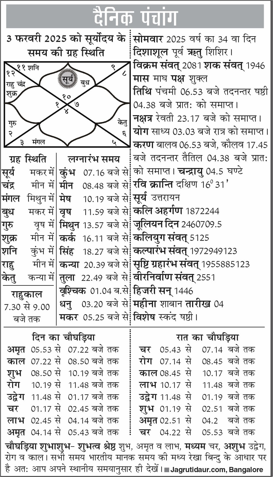 3 फरवरी 2025 को सूर्योदय के समय की ग्रह स्थिति