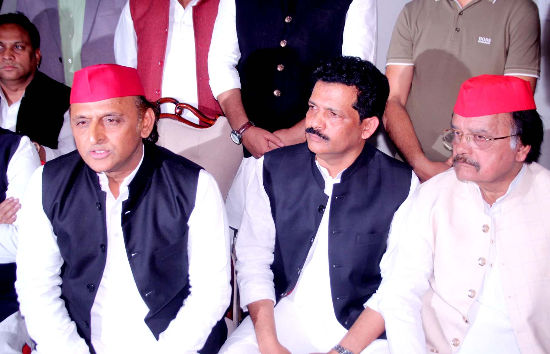 कानपुर में पत्रकारों को संबोधित करते हुए अखिलेश यादव का छायाचित्र