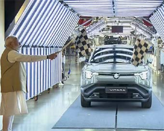 प्रधानमंत्री नरेन्द्र मोदी ने गुजरात के हंसलपुर विनिर्माण संयंत्र से मारुति सुजुकी के पहले इलेक्ट्रिक वाहन ई-विटारा को मंगलवार को हरी झंडी दिखाकर रवाना किया।