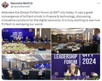 पीएम मोदी ने ‘एक्स पर पोस्ट किया, “आज गिफ्ट सिटी में ग्लोबल फिनटेक फोरम में भाग लिया। यह वित्त और प्रौद्योगिकी में प्रतिभाशाली दिमागों का एक बड़ा संगम था, जिसमें डिजिटल अर्थव्यवस्था के लिए अभिनव समाधानों पर चर्चा की गई। यह देखना वाकई रोमांचक है कि फिनटेक हमारी दुनिया को कैसे नया आकार दे रहा है।”