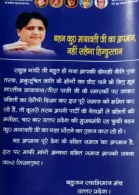 दूसरी तरफ अपनी पार्टी के नेताओं से दलितों की मसीहा चार बार उत्तर प्रदेश की मुख्यमंत्री रह चुकी बहन मायावती का गला घोंटने का एलान करा रहे हैं। पोस्टर में मायावती पर दिए बयान को लेकर निंदा करते हुए माफ़ी की मांग की गई है। कांग्रेस जिलाध्यक्ष पंकज तिवारी ने बताया कि यह केवल विरोधियों की साज़िश है, जो कि जनता को गुमराह करने का प्रयास करते रहते हैं।