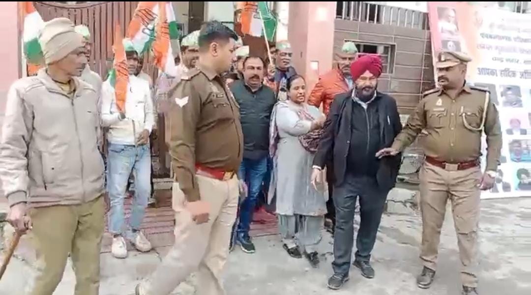 सहारानपुर | गुरुवार को कांग्रेस पार्टी के राष्ट्रीय नेतृत्व के आह्वान पर व प्रदेश नेतृत्व के निर्देश पर कांग्रेस के उपाध्यक्ष चंद्र जीत सिंह निक्कू, विधानसभा प्रत्याशी रही सुखविंदर कौर व सेवा दल के महानगर अध्यक्ष अनुज शर्मा के नेतृत्व में कांग्रेस कार्यकर्ता बलिया खेड़ी ब्लॉक से भाजपा कार्यालय जाने के लिए एकत्रित हुए थे। सूचना पर पहुँची पुलिस प्रशासन टीम द्वारा सब को बल पूर्वक रोक दिया गया। इस अवसर परचंद्र जीत सिंह निक्कू ने कहा की राहुल गांधी ने कहा है की डरो मत और हम योगी, मोदी की कायर सरकार से नहीं डरेंगे ।