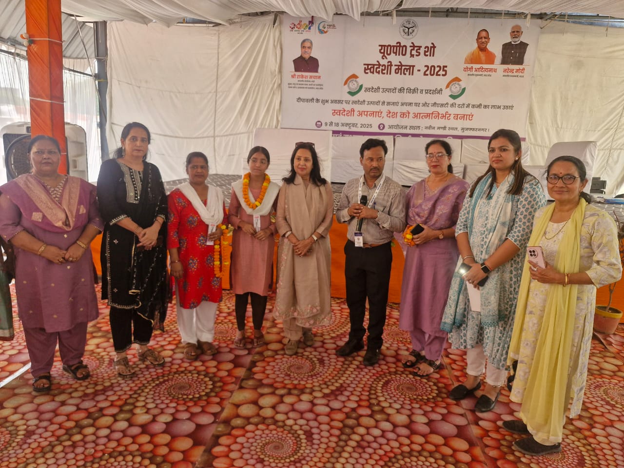 मुजफ्फरनगर। नवीन मंडी स्थल पर जिला प्रशासन द्वारा आयोजित यूपी ट्रेड शो, स्वदेशी मेला-2025 में शुक्रवार को “स्वदेशी” विषय पर गायन प्रतियोगिता का आयोजन किया गया। इस प्रतियोगिता में आंगनबाड़ी कार्यकत्रियों, बालिकाओं और अन्य रचनाकारों ने भाग लिया और देशभक्ति व स्वदेशी के संदेश से भरे गीत प्रस्तुत किए।कार्यक्रम की मुख्य अतिथि नगर पालिका परिषद मुजफ्फरनगर की अध्यक्ष मीनाक्षी स्वरूप रहीं। उन्हें सहायक आयुक्त उद्योग आशीष कुमार ने पुष्पगुच्छ भेंट कर स्वागत किया।
