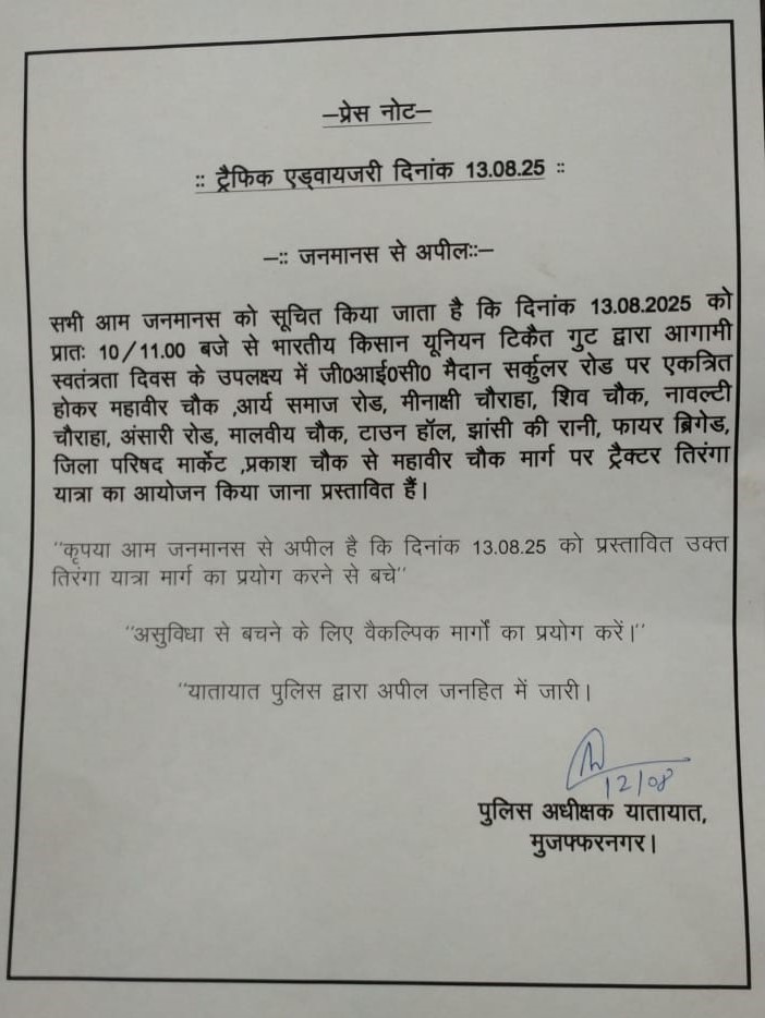 मुजफ्फरनगर। स्वतंत्रता दिवस की तैयारियों के बीच भारतीय किसान यूनियन टिकैत गुट द्वारा 13 अगस्त 2025 को सुबह 10 से 11 बजे के बीच एक विशेष तिरंगा ट्रैक्टर यात्रा निकाली जाएगी। मुज़फ्फरनगर पुलिस द्वारा ट्रेफिक एडवाइजरी जारी करते हुए जानकारी दी कि यह यात्रा जी०आई०सी० मैदान, सर्कुलर रोड से शुरू होकर महावीर चौक, आर्य समाज रोड, मीनाक्षी चौराहा, शिव चौक, नावल्टी चौराहा, अंसारी रोड, मालवीय चौक, टाउन हॉल, झांसी की रानी, फायर ब्रिगेड, जिला परिषद मार्केट और प्रकाश चौक होते हुए पुनः महावीर चौक मार्ग से होकर गुजरेगी।